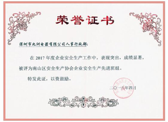 2018年4月20日南山區(qū)安全生產(chǎn)協(xié)會召開“深圳市南山區(qū)安全生產(chǎn)協(xié)會會員大會”,根據(jù)《關(guān)于評選2017年度企業(yè)安全生產(chǎn)先進班組、優(yōu)秀管理人員的通知》的規(guī)定和要求,經(jīng)專家評審小組評定,深圳市九洲電器有限公司人事行政部獲得“2017年度會員單位安全生產(chǎn)先進班組”的榮譽稱號。